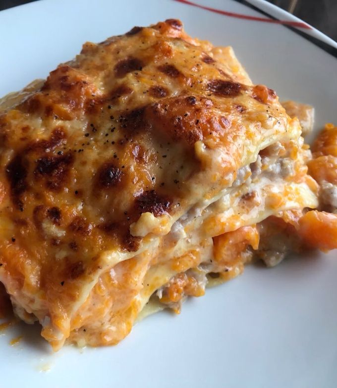 ポルチーニ、ソーセージとカボチャのラザニャ・詰め物のイワシ